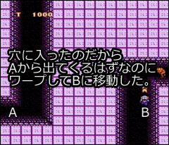 穴に入ったのだから、本来穴の入った後の画面のAの地点に主人公がいるはずなのに、テレポートしてBの地点にワープしました。