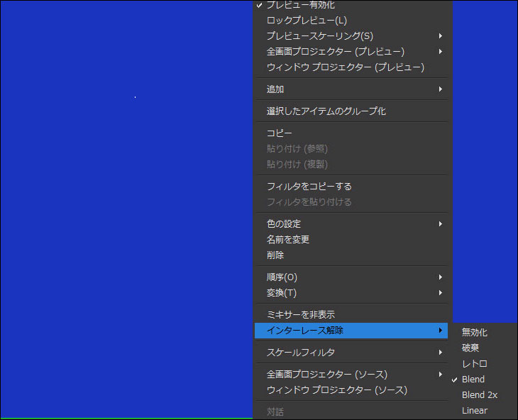 その場合は、上図のようにOBS内に映るキャプチャ結果映像の上で左クリックし、周りに囲い表示された後、そのまま画面の上で(キャプチャ結果のゲーム画面の上で)「右クリック」し「インターレース解除」を選択し「Blend」を選んでいます。