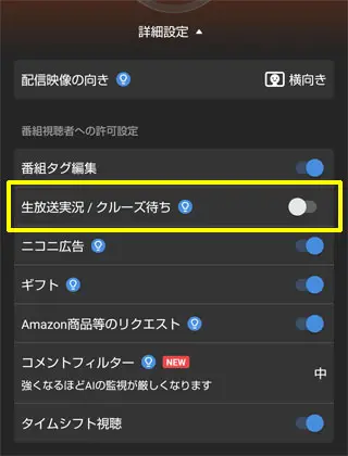 「詳細設定」をひらくと、「生放送実況/クルーズ待ち」という項目があるので、この項目をオフにしてから放送を開始するとクルーズが来なくなります。