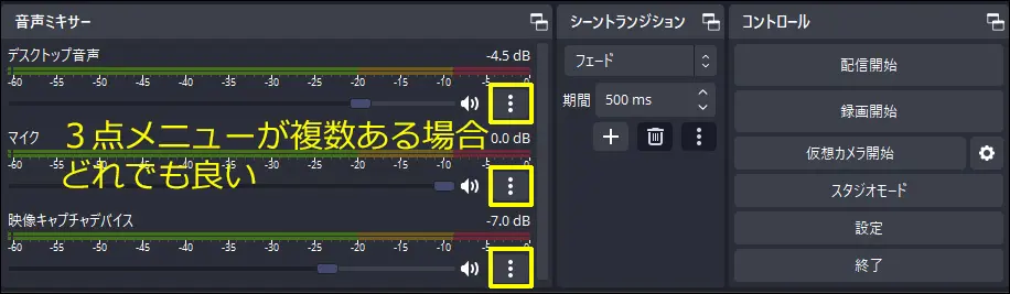 OBSの下部にミキサーがあるので、3点メニュー(ケバブメニュー)から「オーディオの詳細プロパティ(A)」を選択します。