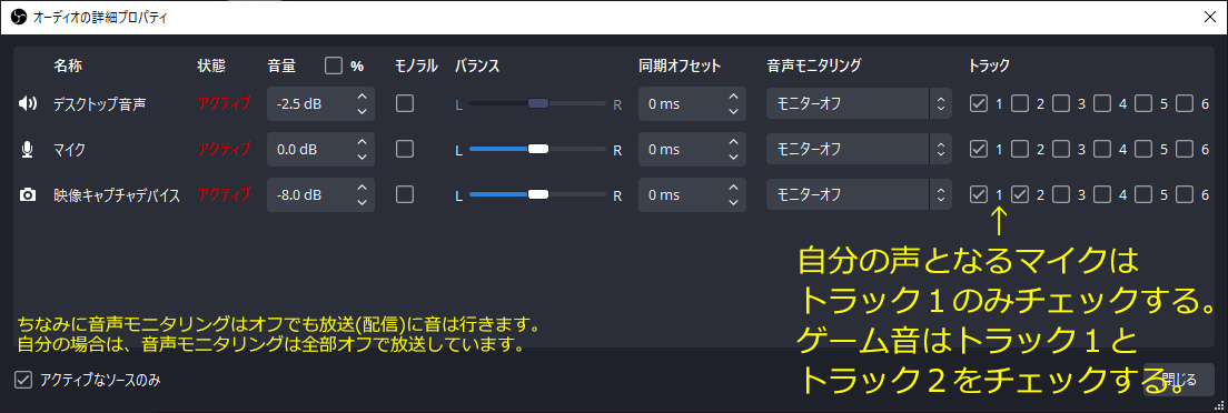 上の画像のトラック2の縦の列を見ると、マイクにチェックが入っておらず、ゲーム音だけにチェックが入っています。