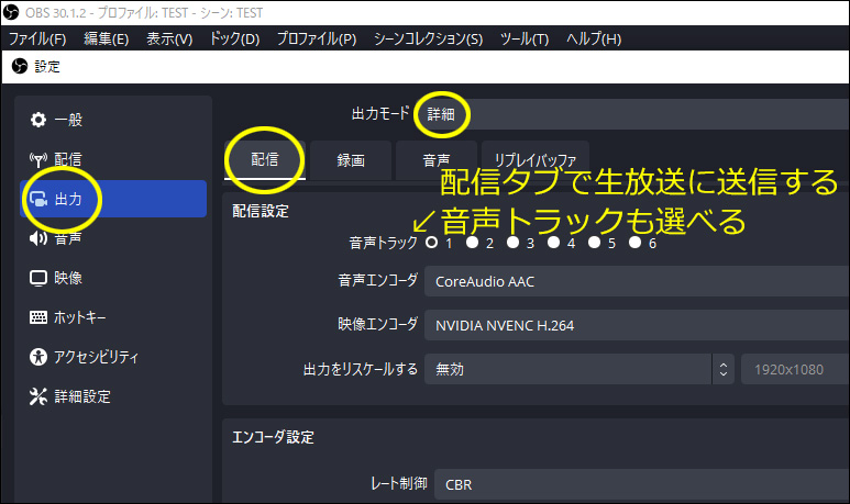 備考1:配信へ送信する音声トラックも変更できる