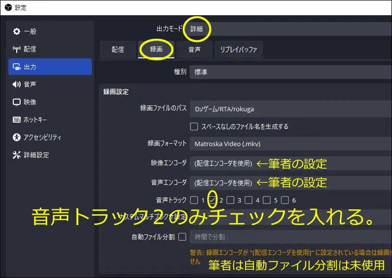 5.録画タブの中に「音声トラック」のチェックボックスがあるので、トラック2のみチェックを入れます。