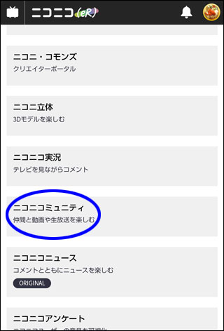 大量の縦に長いメニューが表示されますので、「ニコニコミュニティ」探して選択します。