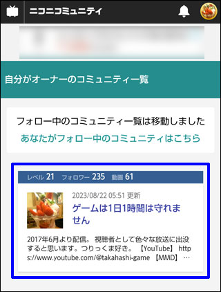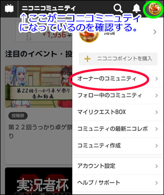 上の画像を見ながら、上のタイトルが「ニコニコミニュティ」になっていることを確認してください。