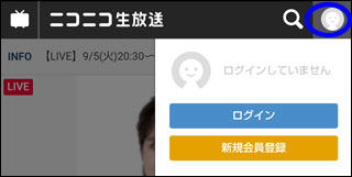 まずはお手持ちのスマホでニコニコ生放送へ移動し、上の画像の右上の青い囲いを選択し、ログインしていない状態なら、自分のアカウントでニコニコ生放送にログインする必要があります。