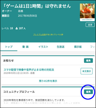 上の画像の青い囲いの【編集】を選択すると、自分のコミュニティ名やコミュニティプロフィールを変更する画面にたどり着くことができます。