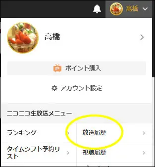 生放送を選択した後、右上の自分のアイコンの上にマウスを持っていくとプルダウンメニューが表示されるので、「放送履歴」を選択します。