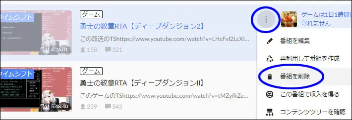 5.自分の放送一覧が表示されますので、削除したい放送を見つけ出し、右の縦3点メニューを選択し、「番組を削除」を選択します。