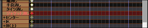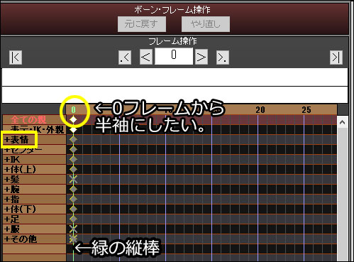 踊りの最初から半袖にしたい場合は、上図のように0フレームに緑の縦棒がくるように、上の茶色背景で黒字のフレーム数値をマウスで選択します。