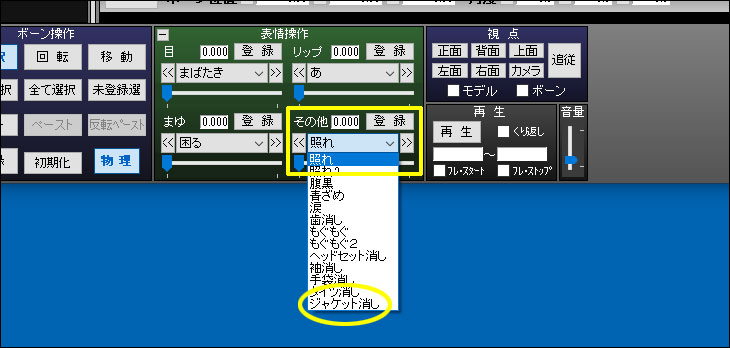 半袖にしたいフレーム数に緑の縦棒があるのを確認してから、上図のように「表情操作」の「その他」から「ジャケット消し」を選択します。
