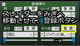 具体的なやり方は150フレームに緑の縦棒をもってきて、表情操作から「ジャケット消し」のスライダーを一番左にして、登録をします。(登録ボタンはスライダーのすぐ上にある)