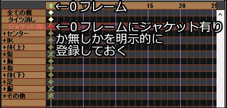 ダンスの途中でジャケットを消して半袖にしたい場合は、ジャケット消しの0フレームに対して、スライダーを一番左にしたジャケットを着ているひし形マークを登録します。