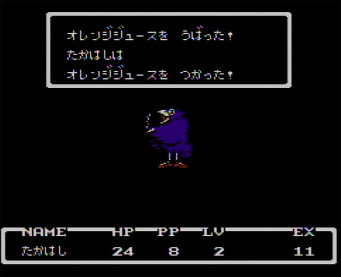 上記のアイテムの並びの時に、戦闘中にアイテム欄の1番下の食べ物(ここでは3つ目のオレンジジュース)をつかうと指示し、これと同じターンでカラスが盗むを実行して主人公のオレンジジュースを盗むと、その下のそうそふのにっきも消えてなくなってしまいます。