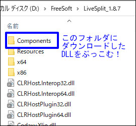 ダウンロードした「LiveSplit.Counter.dll」を、あなたが使用しているLivesplitのフォルダ内にある「Components」フォルダの中へコピー(移動)します。