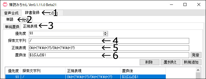 棒読みちゃんは、デフォルトで「単語タブ」の「正規表現タブ」の中に上の4行が記載されています。